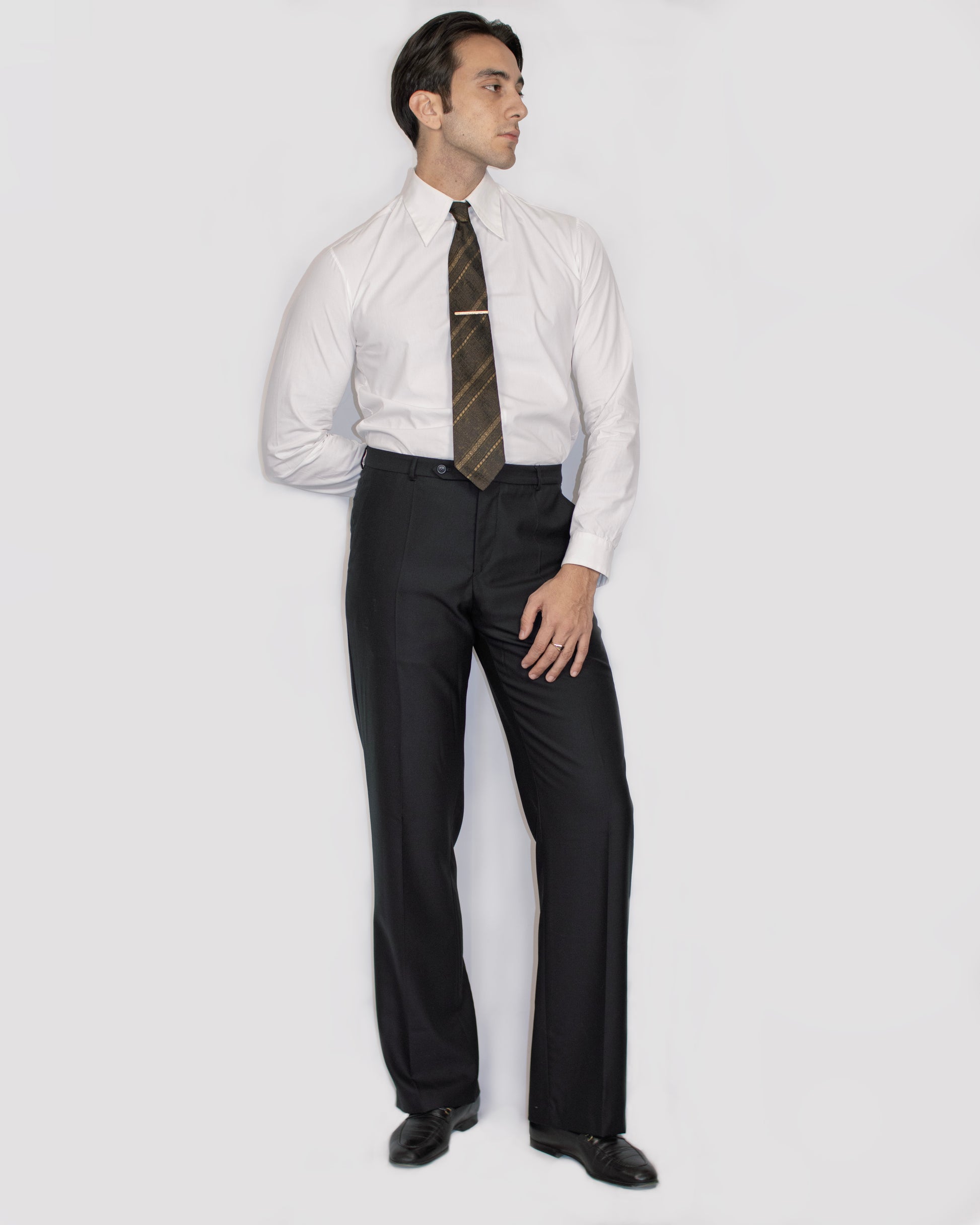 Le pantalon est doté de deux poches en biais sur le devant et de deux poches passepoilées boutonnées à l’arrière, ainsi que d’une fermeture soignée avec glissière, agrafe invisible et boutonnage décalé.