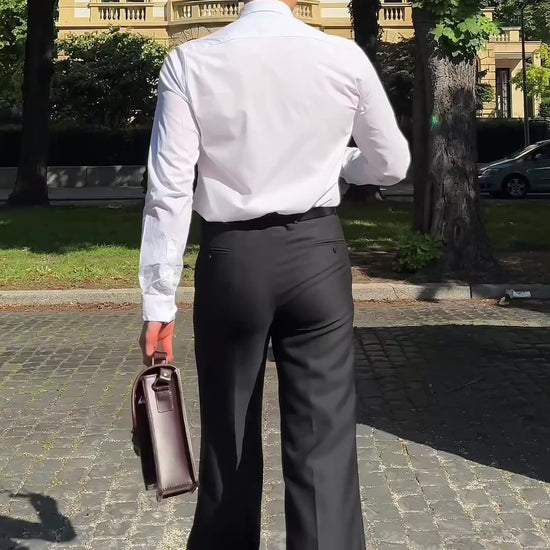Confectionnées dans un sergé exclusif de laine mérinos anglaise Super 120's, d'un grammage de 280g/m², idéale pour toute les saisons. Ce tissu de qualité supérieure, réputé pour sa douceur, son élasticité naturelle et sa résistance, offre un équilibre entre confort et élégance. Sa finition unique par pressage thermique lui confère une brillance subtile et une douceur remarquable, accentuée par la texture luxueuse du tissage sergé.