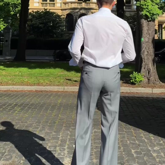 Confectionnées dans un sergé exclusif de laine mérinos anglaise Super 120's, d'un grammage de 280g/m², idéale pour toute les saisons. Ce tissu de qualité supérieure, réputé pour sa douceur, son élasticité naturelle et sa résistance, offre un équilibre entre confort et élégance. Sa finition unique par pressage thermique lui confère une brillance subtile et une douceur remarquable, accentuée par la texture luxueuse du tissage sergé.